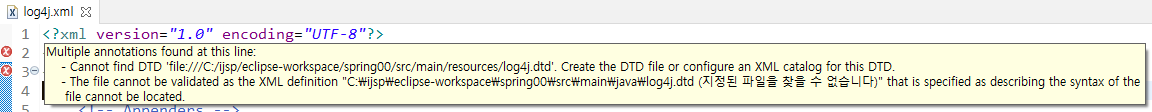Cannot find DTD 'file:///C:/ijsp/eclipse-workspace/spring00/src/main/resources/log4j.dtd'.